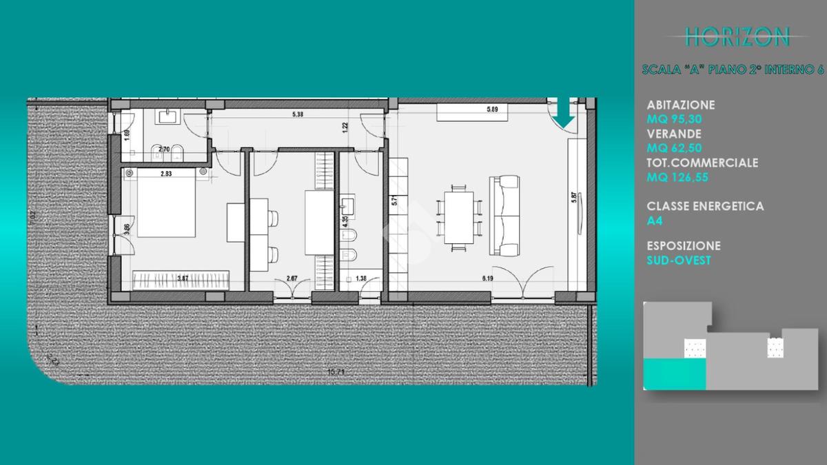Appartamento secondo piano, scala A, 3 vani di circa 95,30 mq+ 62,50 mq composto da: salone con angolo cottura, disimpegno, camera da letto, cameretta e due bagni. Esposizione su ampio balcone angolare.