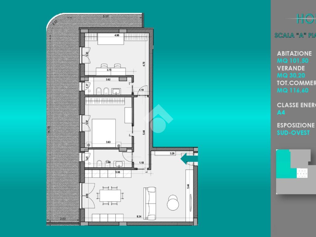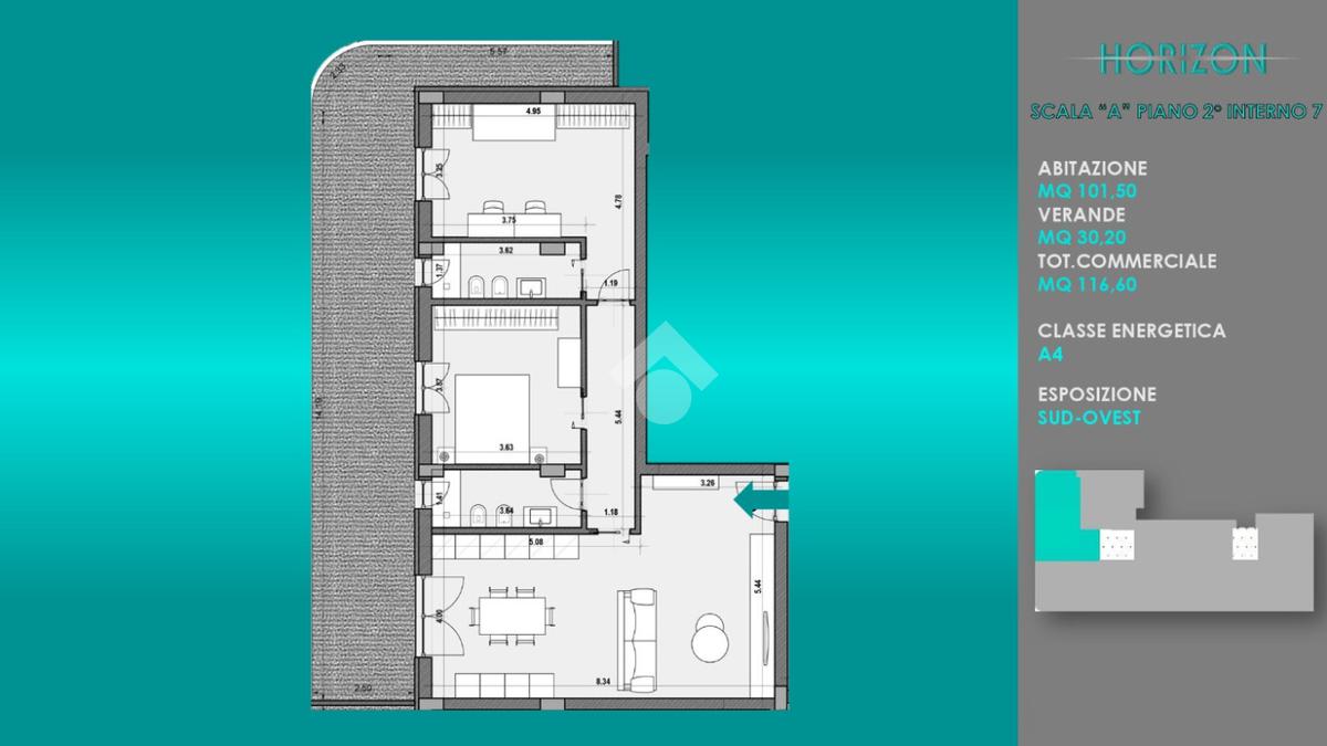 Appartamento secondo piano, scala A, 3 vani di circa 101,50 mq+ 30,20 mq composto da: salone con angolo cottura, disimpegno, camera da letto, cameretta e due bagni. Esposizione su ampio balcone angolare.