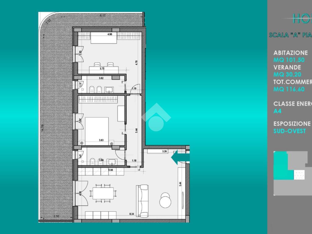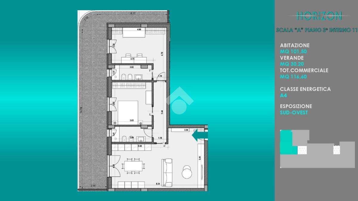 Appartamento terzo piano, scala A, 3 vani di circa 101,50 mq+ 30,20 mq composto da: salone con angolo cottura, disimpegno, camera da letto, cameretta e due bagni. Esposizione su ampio balcone angolare.