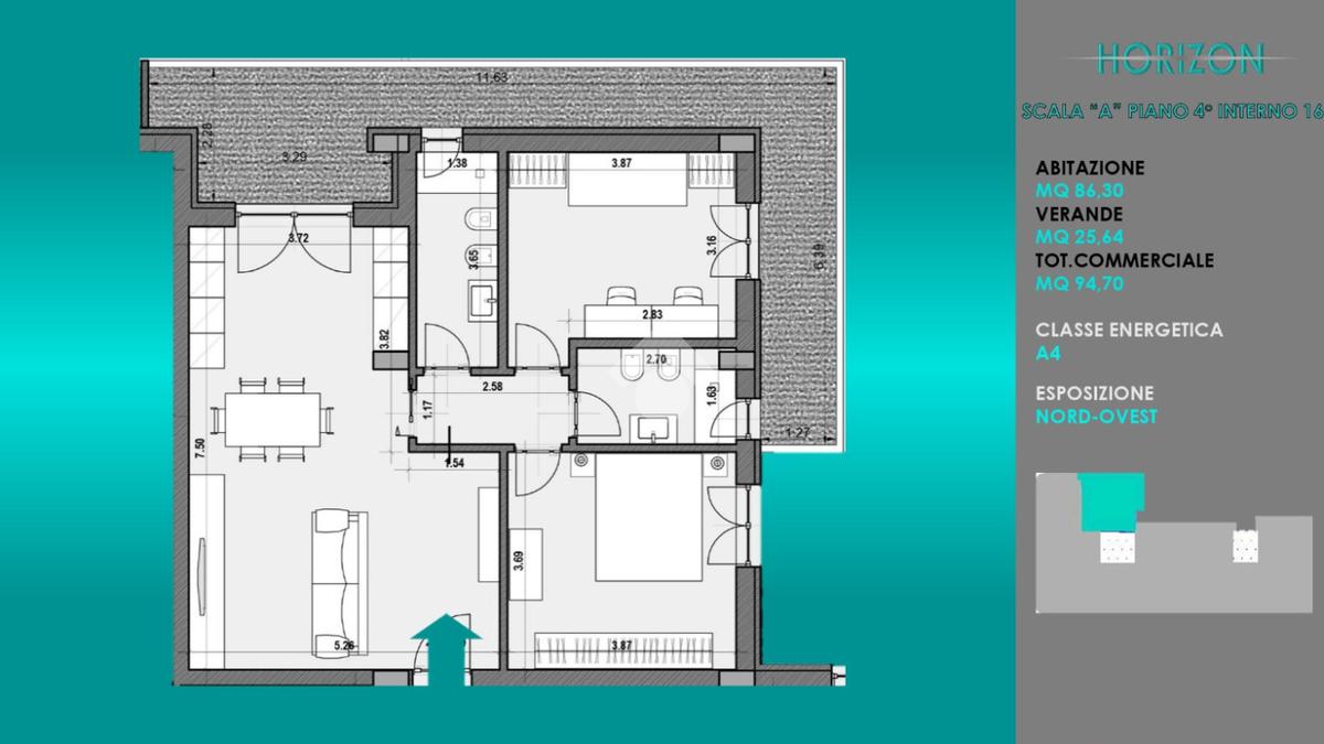 Appartamento quarto piano, scala A, 4 vani di circa 86,30 mq+ 25,64 mq composto da: salone con angolo cottura, disimpegno, camera da letto, cameretta e due bagni. Esposizione su ampio balcone angolare.
