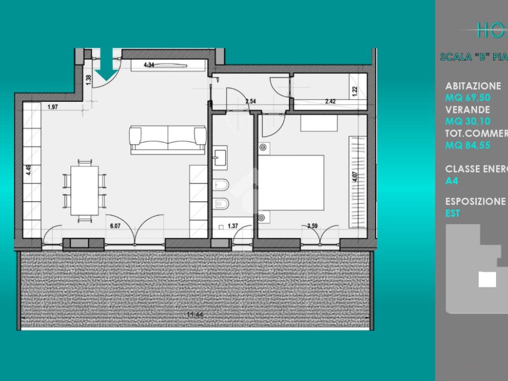 Appartamento terzo piano, scala B, 2 vani di circa 69,50 mq+ 30,10 mq composto da: salone con angolo cottura, disimpegno, camera da letto, ripostiglio e bagno. Esposizione su ampio balcone.